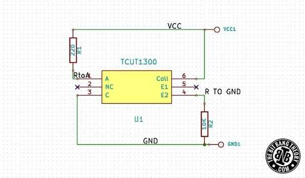 El esquema es muy simple. Sigue el circuito típico de aplicación de la hoja de datos. Utiliza una resistencia de 220 ohm para hacer que una corriente de aproximadamente 0.16mA circula por el LED emisor y una resistencia de 10 K entre transistor de la foto emisor de la salida y tierra. La salida está en la señal R_TO_GND se muestra en el esquema.