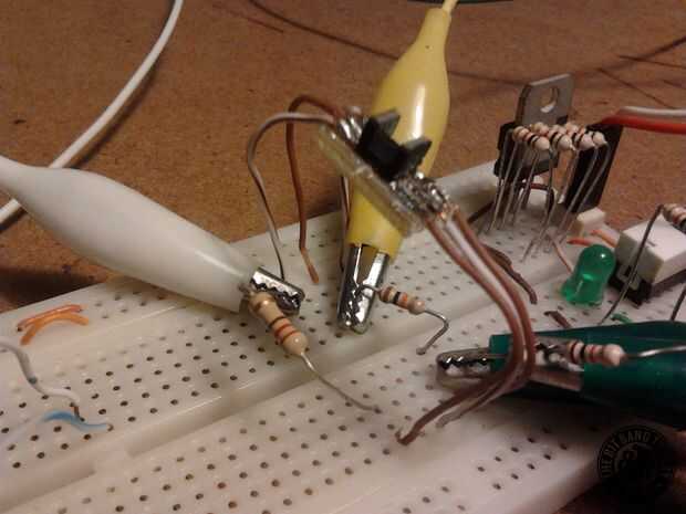 La junta fue diseñada para utilizar resistencias 1/4W y los cables se encajan en los agujeros con los pasadores de la resistencia. Sin embargo, desde que tuve poco espacio y algunos rescatados resistores SMD alrededor, terminé los usando y los cables se sueldan en los agujeros de la resistencia.