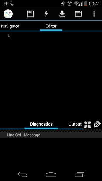 si seguiste correctamente el Instructable esto es lo que verá cuando abra droide de Arduino. Esta interfaz es muy similar al ide del PC y tiene las mismas características.