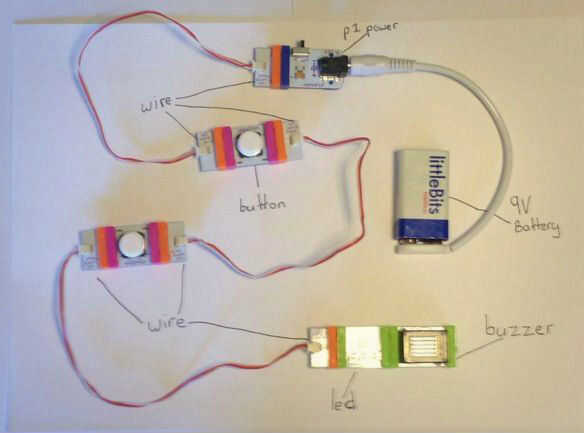 Cada poco es enlaces a la siguiente en este orden: p1 poder, alambre w1, i3 botón, alambre w1, i3 botón, alambre w1, o3 rgb luz, o6 zumbador.