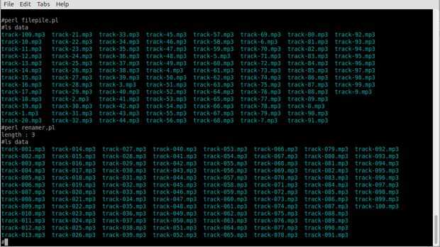 #!/usr/bin/perl<br>use strict; use warnings; use Data::Dumper; my $dir = "./data/"; opendir(D, "$dir") || die "Can't open directory $dir: $!\n"; my = readdir(D); closedir(D); my $len = 1; foreach my $index ( { if (($index ne '.') && ($index ne '..')) { my = split("\\." , $index); my = split('-' , $fn1[0]); if ($len lt length($fn2[1]) ){ $len = length($fn2[1]); } } } #print "length : " . $len . "\n"; my $formatstring = "%0" . $len . "d"; foreach my $index ( { if (($index ne '.') && ($index ne '..')) { my = split("\\." , $index); my = split('-' , $fn1[0]); my $nfn = $fn2[0] . '-' . sprintf($formatstring , $fn2[1] ). '.' . $fn1[1] ; if ($index ne $nfn) { my $cmd = 'mv ' . $dir . $index . ' ' . $dir . $nfn ; `$cmd`; #execute } } }