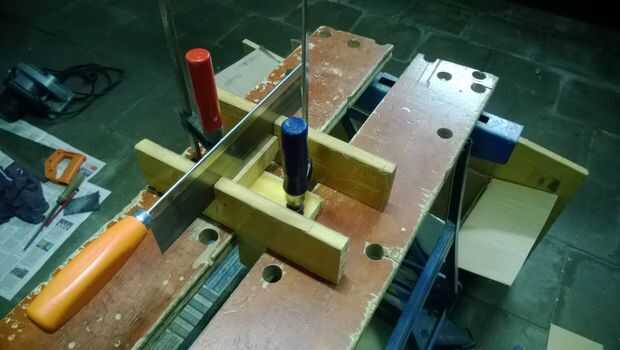 - Vio cada uno de estos bloques por la mitad utilizando un backsaw y una caja de ingletes. (Ver la segunda foto; tu caja de ingletes debe tener un ancho de al menos 10cm aunque. Terminé haciendo mi propia caja de ingletes de ancho variable.)