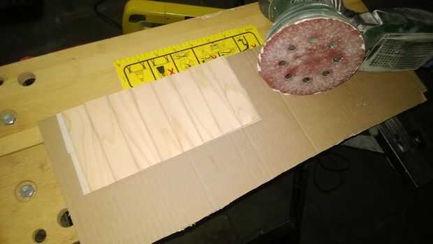 - Por último, utilice una lijadora orbital (o sólo un papel de lija) para ir sobre la superficie de todo el panel frontal y asegurarse de que todas las tiras de madera ahora son al ras. (véase el cuadro quinto)