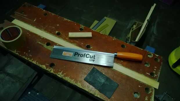 - Con el backsaw, corte 8 cuadras (cada 10 cm de longitud) de la tira larga de madera. (ver la primera foto)