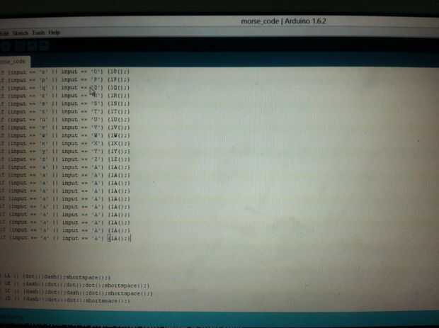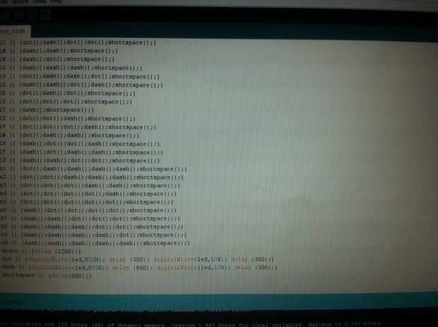 //morse_code by LED/* This code was written by Ebrahim Bawazir in 2013 and updated in 2015 U R FREE TO USE IT AND MODIFY IT AS U WANT ***************** */ int led =13;//the led pin char input;// to save the input void setup () { pinMode (led,OUTPUT);//tell that the 13 pin is an output Serial.begin(9600);//for the connect with the boared }void loop () { if (Serial.available()) { input = Serial.read();//read the input if (input == 'a' || input == 'A') {lA();}//if the input is a or A go to function lA if (input == 'b' || input == 'B') {lB();}//same but with b letter if (input == 'c' || input == 'C') {lC();} if (input == 'd' || input == 'D') {lD();} if (input == 'e' || input == 'E') {lE();} if (input == 'f' || input == 'F') {lF();} if (input == 'g' || input == 'G') {lG();} if (input == 'h' || input == 'H') {lH();} if (input == 'i' || input == 'I') {lI();} if (input == 'j' || input == 'J') {lJ();} if (input == 'k' || input == 'K') {lK();} if (input == 'l' || input == 'L') {lL();} if (input == 'm' || input == 'M') {lM();} if (input == 'n' || input == 'N') {lN();} if (input == 'o' || input == 'O') {lO();} if (input == 'p' || input == 'P') {lP();} if (input == 'q' || input == 'Q') {lQ();} if (input == 'r' || input == 'R') {lR();} if (input == 's' || input == 'S') {lS();} if (input == 't' || input == 'T') {lT();} if (input == 'u' || input == 'U') {lU();} if (input == 'v' || input == 'V') {lV();} if (input == 'w' || input == 'W') {lW();} if (input == 'x' || input == 'X') {lX();} if (input == 'y' || input == 'Y') {lY();} if (input == 'z' || input == 'Z') {lZ();} if (input == '1') {n1();}// the numbers if (input == '2') {n2();} if (input == '3') {n3();} if (input == '4') {n4();} if (input == '5') {n5();} if (input == '6') {n6();} if (input == '7') {n7();} if (input == '8') {n8();} if (input == '9') {n9();} if (input == '0') {n0();} if (input == ' ') {space();}//the space Serial.println (input);//print the latter saved in the input var } } //fonctions for the letters and the numbers void lA () {dot();dash();shortspace();}//letter A in morse code! void lB () {dash();dot();dot();dot();shortspace();}//same for B void lC () {dash();dot();dash();dot();shortspace();} void lD () {dash();dot();dot();shortspace();} void lE () {dot();shortspace();} void lF () {dot();dot();dash();dot();shortspace();} void lG () {dash();dash();dot();shortspace();} void lH () {dot();dot();dot();dot();shortspace();} void lI () {dot();dot();shortspace();} void lJ () {dot();dash();dash();dash();shortspace();} void lK () {dash();dot();dash();shortspace();} void lL () {dot();dash();dot();dot();shortspace();} void lM () {dash();dash();shortspace();} void lN () {dash();dot();shortspace();} void lO () {dash();dash();dash();shortspace();} void lP () {dot();dash();dash();dot();shortspace();} void lQ () {dash();dash();dot();dash();shortspace();} void lR () {dot();dash();dot();shortspace();} void lS () {dot();dot();dot();shortspace();} void lT () {dash();shortspace();} void lU () {dot();dot();dash();shortspace();} void lV () {dot();dot();dot();dash();shortspace();} void lW () {dot();dash();dash();shortspace();} void lX () {dash();dot();dot();dash();shortspace();} void lY () {dash();dot();dash();dash();shortspace();} void lZ () {dash();dash();dot();dot();shortspace();} void n1 () {dot();dash();dash();dash();dash();shortspace();}//number 1 in morse code void n2 () {dot();dot();dash();dash();dash();shortspace();} void n3 () {dot();dot();dot();dash();dash();shortspace();} void n4 () {dot();dot();dot();dot();dash();shortspace();} void n5 () {dot();dot();dot();dot();dot();shortspace();} void n6 () {dash();dot();dot();dot();dot();shortspace();} void n7 () {dash();dash();dot();dot();dot();shortspace();} void n8 () {dash();dash();dash();dot();dot();shortspace();} void n9 () {dash();dash();dash();dash();dot();shortspace();} void n0 () {dash();dash();dash();dash();dash();shortspace();} void space () {delay (1200);}//space between words void dot () {digitalWrite(led,HIGH); delay (300); digitalWrite(led,LOW); delay (300);}//the dot this code make the led on for 300 than off for 300 void dash () {digitalWrite(led,HIGH); delay (900); digitalWrite(led,LOW); delay (300);}//the dash this code make the led on for 900 than off for 300 void shortspace () {delay(600);}//space between letters /*done*/ cualquier Q preguntar y te respondo.