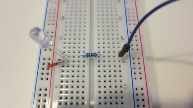 Primero configurar la placa para conectar los dos LEDs y un altavoz como se ve en el diagrama de cableado. Conecte el puente pequeño de la tierra a una fila. En una segunda fila Conecte un cable de puente más largo y una resistencia. La luz LED o altavoz salvará estas dos hileras. Al conectar el LED, la pata positiva (más de los dos cables que salen de la LED) debe conectarse a la línea con la resistencia y la pata negativa estará en la fila con conexión a tierra.