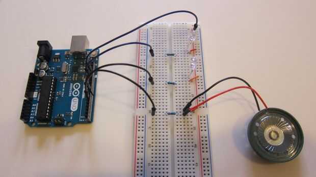 Ahora que tienes la placa con cable se conectará a la Arduino. En el código utilizaremos clavijas de salida de seis y doce para el LED y el pin 8 para el audio. Conecte los dos cables de puente más largo con el LED en línea para seis y doce en el Arduino. Conecte el cable de jumber más largo con el altavoz a pin ocho. Por último, conectar la clavija de tierra en el bus de tierra en la parte superior de la placa.