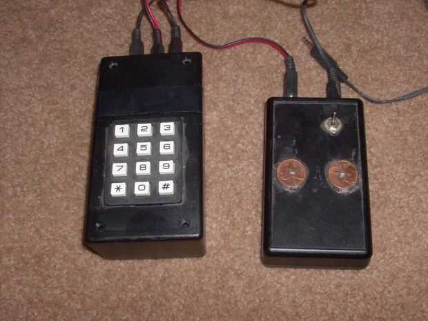Soy perfectamente consciente de que esto parece un poco enrevesado con dos cajas y tres conjuntos de cables, pero oso conmigo ya que es un método para mi locura. Lo principal es ergonomía. La caja grande que contiene el sello, el relé y el teclado es un poco demasiado alta para descansar la mano cuando se utiliza al conmutador táctil. También es bastante completo de cables! Además, la pequeña caja tiene una tapa extraíble para la pila de 9 voltios que alimenta el acuerdo entero. Así que... desde el poder estaba en el conmutador de la caja tuvo que conseguir el poder para el sello y por lo tanto tenía que tener un cable de alimentación y un conjunto de cables del circuito conmutador de la caja grande que contiene el sello y el teclado. La salida del transmisor es simplemente un 3,5 mm conector de audio que está en corto circuito el relé vía Pin 15 del sello que es la única salida del pin, todos los otros pines son las entradas.