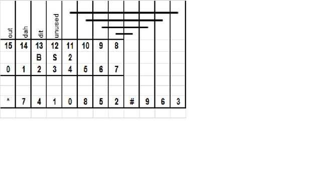 Para la placa de circuito principal he utilizado un trozo de placa perforada que funciona bien para conectar el teclado a los pernos en el sello. Entradas de teclado a los pines 0 a 11 y entradas desde el conmutador táctil pines 13 y 14. La tierra del manipulador va al carril de tierra. PIN 12 es inusitado pero debería intermedia a tierra de todos modos. Salida a relé es de 15 pines. La fuente de alimentación (+ y -9 voltios) en un par de pistas, el DIT de entrada al PIN 13 y el DAH de entrada al PIN 14. Nota que estas entradas son normalmente altas así que conecte resistencias de 10K a los + 9V rieles y los pernos de BS2 para amortiguar las entradas para cada uno. Utilice cable de calibre pequeño (24 o 26) trenzado para conectar el teclado a la placa. He usado calibre 22 que hace un poco difícil doblar la masa de los cables en la caja. Conecte el común del teclado en el riel de + 9 voltios en el PCB y luego todas las claves de la placa perforada (ver mi esquema que muestra las entradas de teclado y pernos de la entrada-salida de BS2). Las líneas horizontales son puentes (para #, 9,6,3) hacia el lado opuesto de la BS2. Su esquema puede ser diferente, por supuesto y asegúrese de que guardarlo en algún sitio para referencia futura. Entradas desde el teclado son normalmente bajas tan conectarse 10 K resistencias el carril de tierra y cada PIN de entrada para estas entradas de búfer.