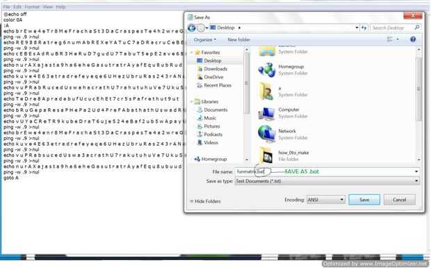 - Guarde el archivo como .bat extensión. (Dar un nombre a su matriz y luego reemplazar el .txt por .bat