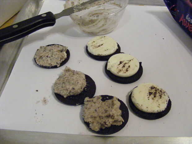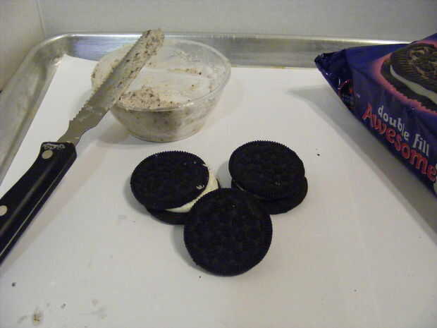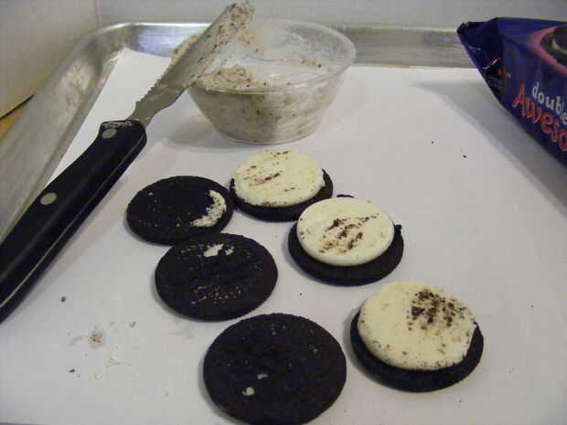 Tome su cookie y suavemente le dan un toque a bajar uno de los lados. Dejar intacto el relleno y el otro lado de la cookie.