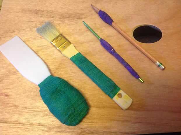 ¿Lápices, herramientas o agujas cavar surcos en los dedos? Coflex al rescate. Claro, usted podría utilizar sugru, pero te costará mucho más y tienes que esperar a que se seque. Sólo cortar o doblar su coflex a la anchura deseada y envolver alrededor del objeto para algunas capas, tirando firmemente mientras lo hace. Cuando tienes la cantidad de relleno que desee, usted puede presionar hacia abajo los bordes para redondearlos y apriete en forma. Es un poco moldeable, y si usted necesita diferentes profundidades sólo capa donde la tienes. También puede poner acolchado bajo el coflex, he hecho tiras de tela de tejido o chatarra para crear sustancia o relleno. Coflex también crea una superficie antideslizante, enróllelo alrededor de las herramientas con mangos resbaladizos. También utilizar para crear botones para mantener las cosas en los titulares. Si el coflex se siente "pegajoso" Envuelva una capa final de la tela (regulares vendas o paños desechables trabajo grande para esto)