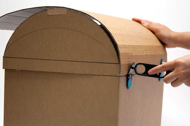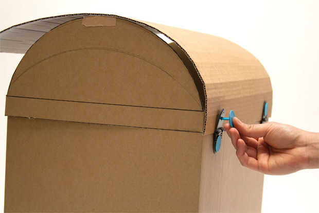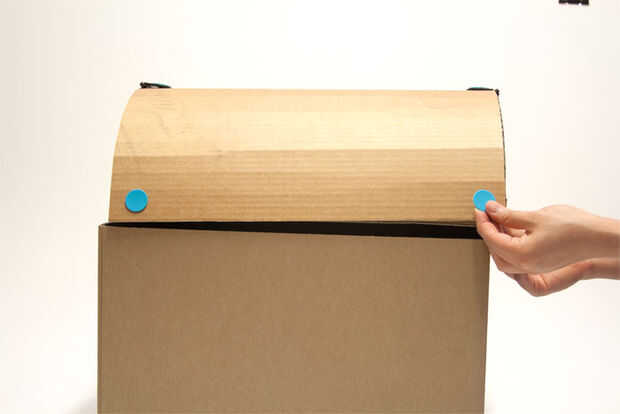 Para asegurar el cartón curvado a la tapa, conectar con Makedo cerradura-bisagras y re-clips en la parte posterior del cofre del tesoro.