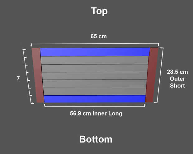 Ahora las tablas largo interiores dependen de estas juntas dos 28.5 cm. Por lo que es 65cm - x, x es el ancho de las dos juntas exteriores corto (no sólo multiplicar uno, pero agregando y en ambos extremos). Para que salieron a 56,9 cm (en este caso lo mismo, pero para los lados algunos donde unos milímetros apagado).