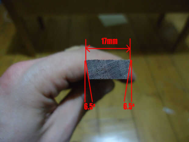 Cortar lo que quedaba del nogal 6mm en tiras en la Sierra de mesa. tiras de 16, 17mm de ancho, con el conjunto de la Sierra de mesa a 6,5 grados. Éstos entonces consiguieran cortar a la longitud (230mm) en la Sierra de inglete.
