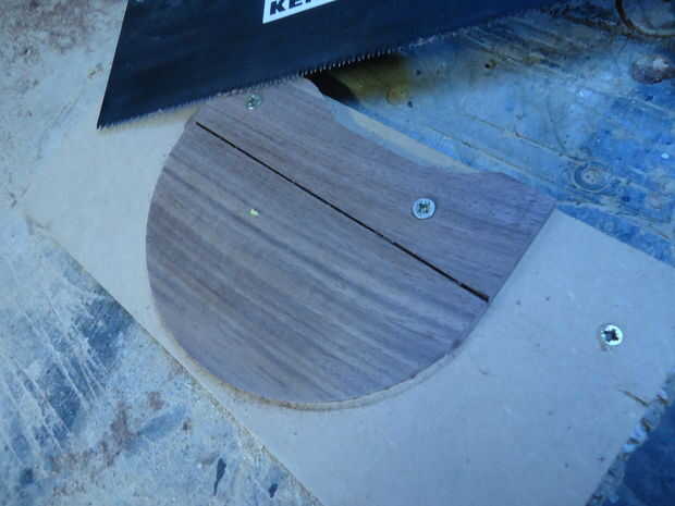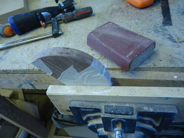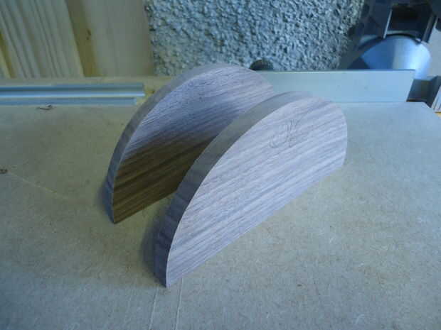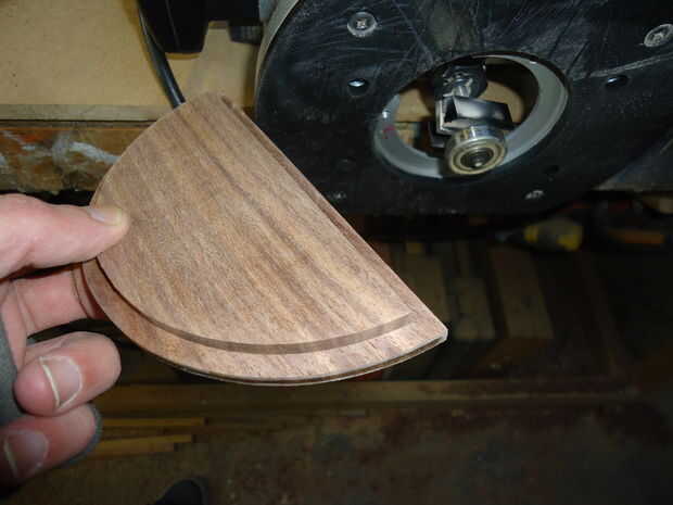 So... Tomé los otros pedacitos de nuez de 10mm, marcado mi semicírculos (d = 153) y cortar hacia fuera usando la guía de círculo en mi pequeña herramienta dremel. Necesitaba las dos piezas que encajen perfectamente y hubo muchos errores de la dremel, así que juntos les graba y les arena, por lo que se bonito y al ras. Cada una de las piezas laterales entonces consiguió una rebaja de 6mm (router) en el interior borde.