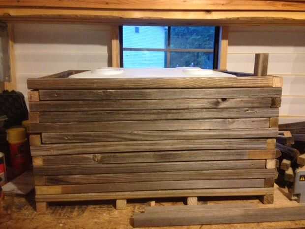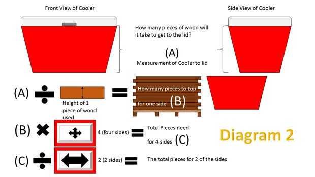 Ahora hacer algunos cálculos más, probablemente hay una forma más fácil, pero yo no soy un matemático (claramente). Yo quería encontrar, barrotes para llegar a la parte inferior de la tapa del total = altura del enfriador para tapa dividida por la altura del balaustre o más altura a la tapa dividida por la anchura de la madera utilizada = total piezas madera para llegar a la cima para un lado. Tomar los trozos de madera total para llegar a la parte superior de un lado X 4 (cuatro lados) = cuantas piezas de madera para cortar en total. Pero dos cortes diferentes, tomar la cantidad de cuantas piezas para cortar dividen por 2 (dividiendo la longitud y anchura), y que decirte cuántos long (largo) y corto (anchura/profundidad). (Ver diagrama 2)