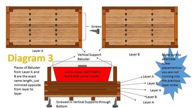 Ahora que ya tenemos la base, su tiempo para hacer las paredes. Sé que este patrón probablemente se llama algo, pero esto es donde cada capa de barrotes son en uno otro (Diagrama 3). Medir la longitud de la parte delantera y menos la profundidad de la barandilla para obtener mi tabla anterior y posterior. Si trabaja con barrotes cortan a la medida y hacia abajo.