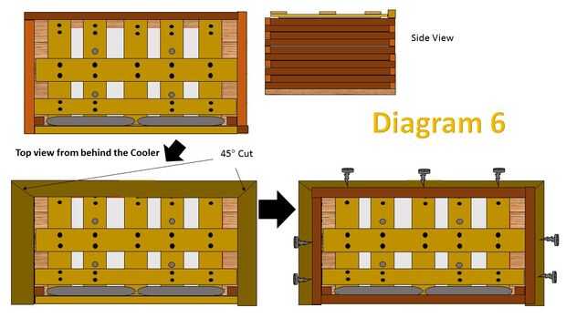 Luego añadí tres piezas más de madera, paralelo a las dos piezas a la tapa de la hielera, con 2 piezas largo perpendicular sobre el ahora 5 piezas sobre la tapa (Figura 6). Ahora debemos ser unos que incluso la barandilla atamos en la parte posterior. Lo que hice a continuación fue construir un labio que sobresalga hacia fuera el cuerpo de las paredes del pecho. Usé tres piezas delgadas de madera cortada en un ángulo de 45 grados.