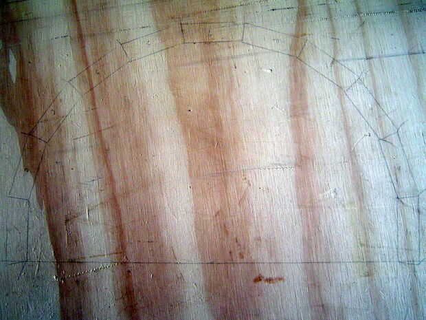Generar el patrón de los extremos solo trazando el contorno trapezoidal de una de sus tablas 10 veces en otro tablero, como se muestra en la imagen. Más cuidadoso, mejor se verá. Corte en el interior la línea usando un rompecabezas o un serrucho (mi piso mirada como en la imagen después de este paso). Utilice la pieza de extremo cortado como plantilla para el otro extremo.