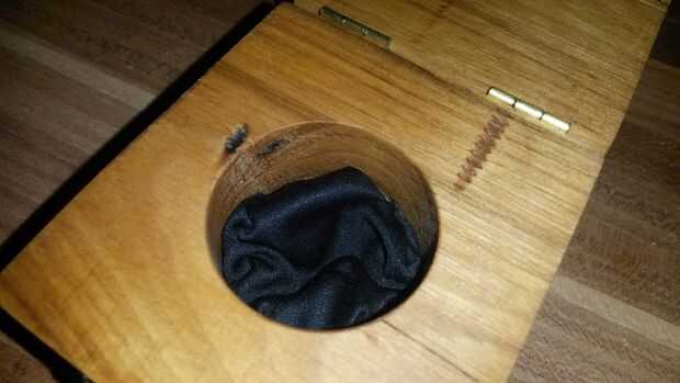 Para hacer el interior de la caja un poco más elegante busca utilicé algo de tela negra y rellenas un pequeño trozo de ella en el agujero y envueltos cuidadosamente. También puede utilizar algunos terciopelo o similar que haría aún más precioso buscando.