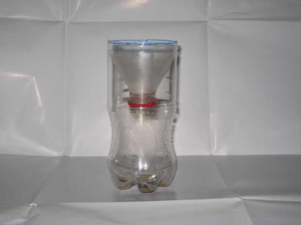 Después de cortar la botella y tiene dos partes. Entonces puede toma la parte superior de la botella (consumo final) y ponerlo boca abajo en la parte inferior. Una vez hecho esto usted luego cinta adhesiva para unir las dos partes sin cinta adhesiva sobre la parte superior de la botella.