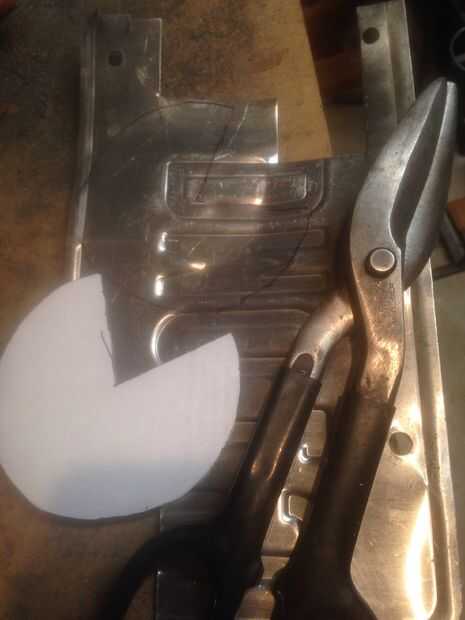 He hecho un círculo de 4 pulgadas de diámetro en un pedazo de papel de desecho y recórtalo. Quité una cuña de unos 80 grados de ancho (2 1/4 pulgadas entre las esquinas). Transferí el patrón de papel a la parte trasera de una vieja placa de licencia.