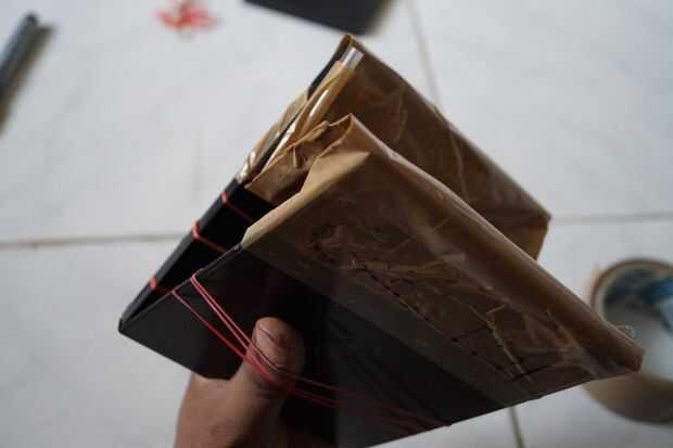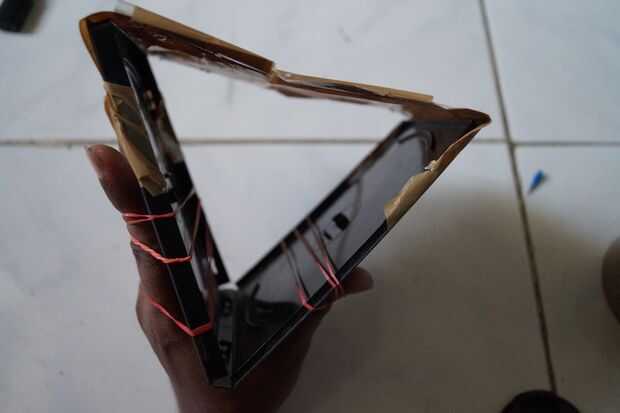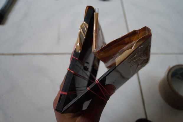 Cinta la hoja (de cinta) con la caja del CD tal que hoja es totalmente elástica cuando el caso está medio abierto como se muestra en la foto. Y piezas de relleno para lateral de modo que dar soporte.