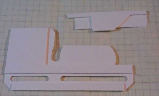 La pieza de extraña forma va en la parte más pequeña de la cara exterior con el borde largo alineado contra el borde de la tarjeta.