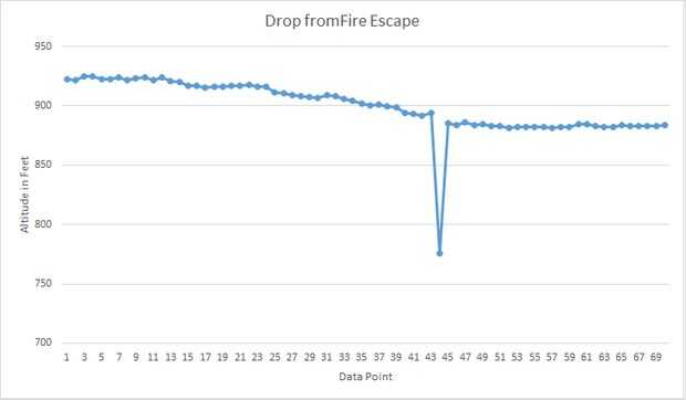 Para probar el código, el dispositivo fue caído apagado el incendio para ver qué tan rápido podrían grabarse datos. La altura inicial es 922,84 pies sobre el nivel del mar y la altura final es de 882,86 pies sobre el nivel del mar. El dispositivo fue abandonado alrededor de punto de datos 13 y tierras en el punto 44.