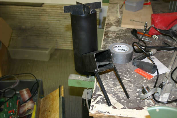 pequeño cohete camping metal de la estufa. El cuerpo se hace del perfil de 150 / 100mm cierre la cámara de combustión con perfil 80 / 80mm de metal. El alimentador es otra vez una pieza de Perfil de 150/100. El espacio entre el cuerpo y la cámara est