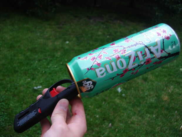 2. pegar el encendedor en la lata y oprima el gatillo en el encendedor.