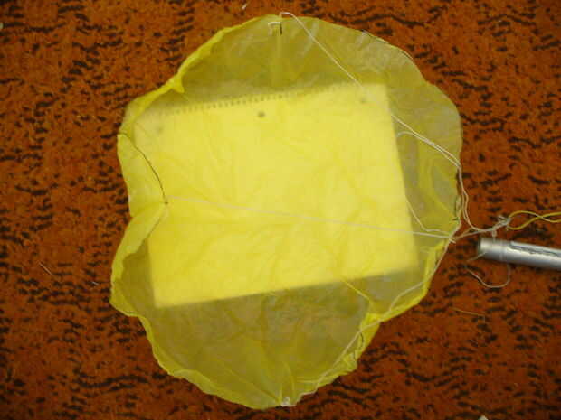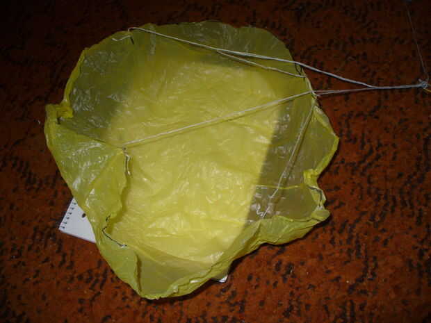 En primer lugar vamos a hacer el paracaídas para nuestro sistema de recuperación. Es necesario que sea al menos un pie de diámetro. Este paso es algo auto explicativo. Un tamaño moderadamente bueno de un bolso de compras plástico servirán este propósito bien. Remontar un marcador alrededor para hacer un círculo y luego cortar esto cuidadosamente. Siguiente. usted necesitará hacer cuatro 14" cordones (o alambres) para el paracaídas en los sectores del barrio. Ahora, cuidadosamente atar los otros extremos en un nudo grande. Tienes que probar este paracaídas para asegurarse de la exactitud en su flotador vertical al suelo, giro mínima y rigidez. Inspeccionar los sectores donde el cable se ata el paracaídas para asegurarse de que está todavía firmemente vinculado. Cuando el paracaídas ha cumplido con sus estándares, cubriendo en pegamento para asegurar los sectores. Se trata de una ayuda excepcional para el paracaídas. Si lo desea, puede usar hilos más para un paracaídas mejor, pero lo hará mucho más complicado.