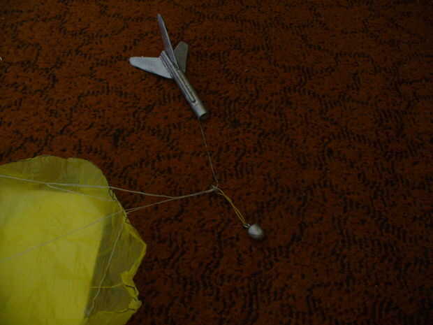 amablemente me estrecho, te lo agradeceria. Até la cuerda al tubo en el paso 5 y los cordeles juntos desde el paracaídas en el paso 2 para la banda de goma (cable de choque) en el paso 4. No creo que esta es la manera correcta, pero eso es como lo hice. Asegúrese de que estos nudos son muy seguros ya que la carga de la eyección es bastante potente. Utilizando pegamento, aquí es una buena idea también.