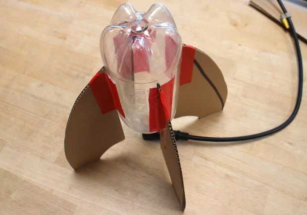 Con la boca de la botella hacia abajo, coloque las aletas con la cinta, igualmente espaciadas alrededor de la botella. Tenía las aletas actúan como un soporte para el cohete de la botella, colocado a una altura que deje suficiente espacio en el cohete para instalar la bomba de la bicicleta en el corcho.