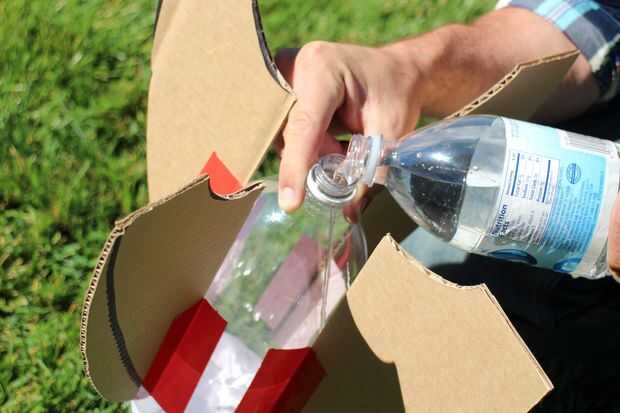 Te sugiero llenar cerca de 10% con agua, aunque, se puede experimentar y encontrar lo que usted piensa funciona mejor para tu cohete.