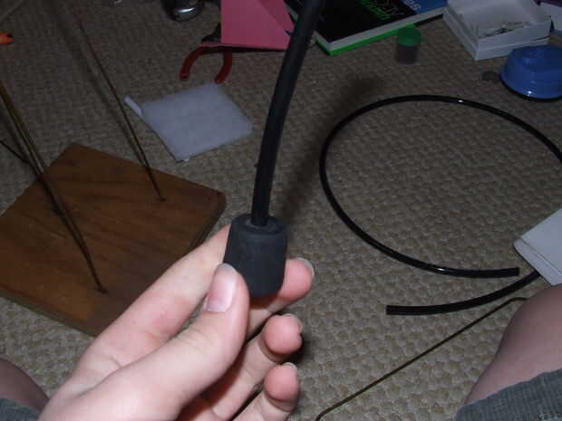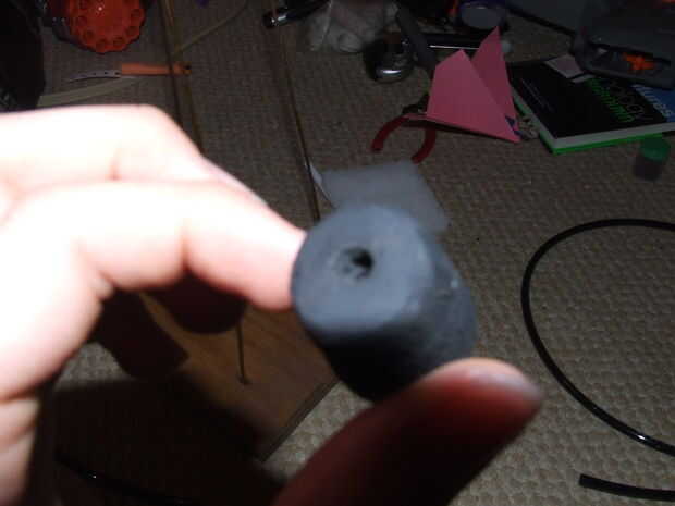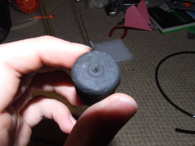 En segundo lugar, taladre los orificios en ambos extremos. Perfore el orificio más pequeño en primer lugar, porque puede utilizarlo como una guía para el agujero más grande. De todos modos, taladro 1/16 como cerca de la mitad como puedas. Luego perfore el 5/32 hacer que usted perfore el extremo más grande HOILE en el diluyente. Tienes que pegar la tubería/paja en ello. El extremo más fino va dentro de la botella.
