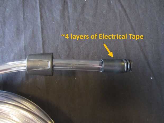 Envolver el final de la 3/8 X 1/4 pulgadas claro tubo de vinilo que contiene comprobar valor de ventilación con 4 capas de cinta aislante. Cinta eléctrica se utiliza para proporcionar espesor adicional para el tubo de vinilo transparente para que se asiente mejor en la carcasa de la manguera cuando está enroscada la tuerca de la manguera de la bomba.