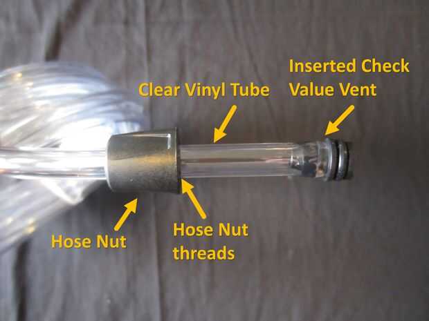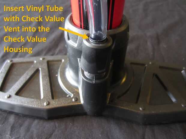 Inserte el extremo del tubo de vinilo transparente con Compruebe valor al orificio comprobar valor; Asegúrese de que comprobar valor disco la bomba estaba todavía presente. Atornille la tuerca de la manguera de bomba en el Compruebe valor de vivienda hasta que este apretado. Si eres capaz de Levante (suavemente) en el tubo de vinilo transparente y sentirla a desbancar un poco del agujero de valor Compruebe dentro de la carcasa de la manguera, aplique una capa adicional o dos de cinta aislante en el tubo de vinilo transparente.