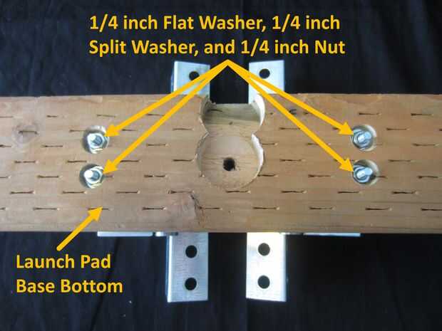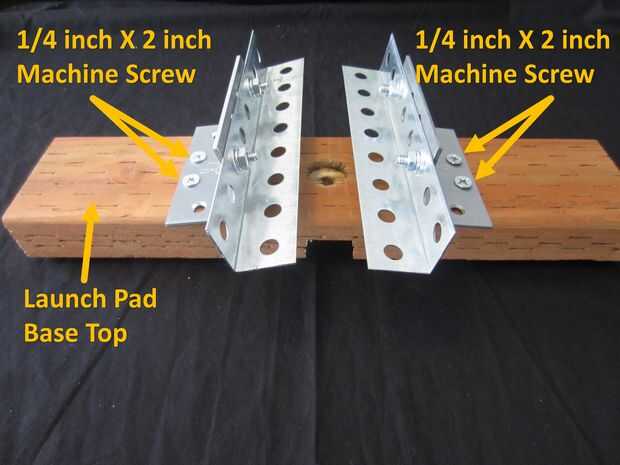 Usando un 1/4 pulgadas X 2 pulgadas tornillo, arandela plana 1/4 de pulgada, 1/4 de pulgada split lavadora y combinación de tuerca 1/4 de pulgada, tornillos de máquina de hilo a través de la plataforma de lanzamiento abrazadera bisagra para Base de plataforma de lanzamiento.