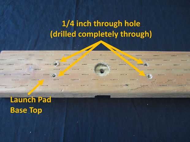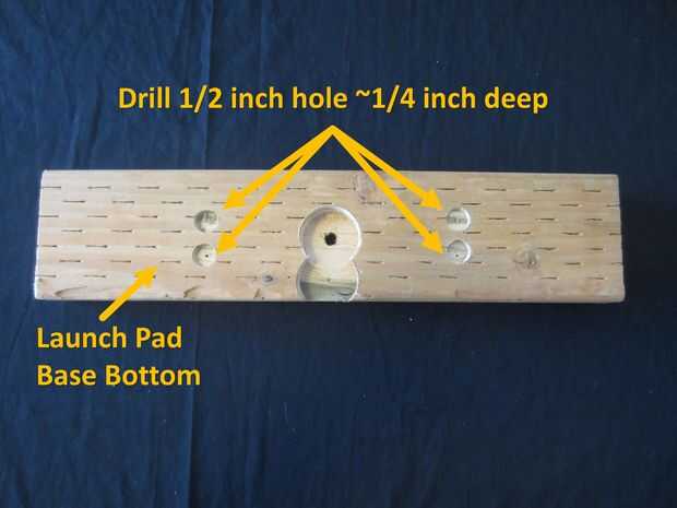 Taladro de 1/2 agujero ~1/4 pulgadas profundidad utilizando picas o Forstner bit en la parte inferior de la Base de la plataforma de lanzamiento donde las cuatro bisagras agujeros perforados a través de.