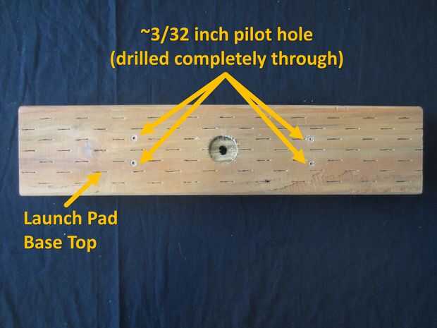 Taladre un orificio guía pequeña (~3/32 pulgadas poco) en cada uno de la bisagra de Launch Pad Base marcada orificios asegura hoyo piloto pasa completamente a través de.