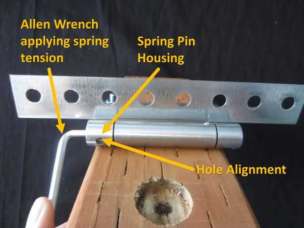 Con Allen Wrench siempre con el kit de bisagra, coloque la abrazadera de la plataforma de lanzamiento de bisagra del resorte bajo tensión leve e Inserte el pasador en la carcasa del resorte Pin. Encontré que la tensión en la primera configuración parece tener suficiente fuerza de contracción.