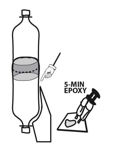 Ok, esta es la parte difícil. Abrir el pegamento (o pegamento de su elección). Exprimir una pequeña cantidad (lo suficiente para hacer una aleta). Mezclar el epoxi con un pedazo de núcleo de espuma (esto también lo estará su "cepillo"). Marca previamente su botella (con marcador) donde quieras tus aletas a la línea de arriba. Asegúrese de que las aletas caben su botella antes de ponerse cualquier pegamento. Recorte o ajuste si es necesario. Aplicar el epoxi a su fin y adjuntarlo a la botella. ADVERTENCIA: Este paso requiere paciencia! 5 minutos es mucho tiempo. Si usted puede averiguar una manera de hacer algunas abrazaderas, más poder para ya. Mientras sujeta la aleta, no dejes que cambio... usted será capaz de mover y ajustar la aleta mientras que el epoxi se está secando, pero una vez que empieza a, es difícil de ajustar. Que te sienta que empieza a establecer. Una vez que llega al punto donde se puede verdad ajustarlo más, puede colocar las botellas y la aleta, en la mesa para fijar sosteniéndolo.
