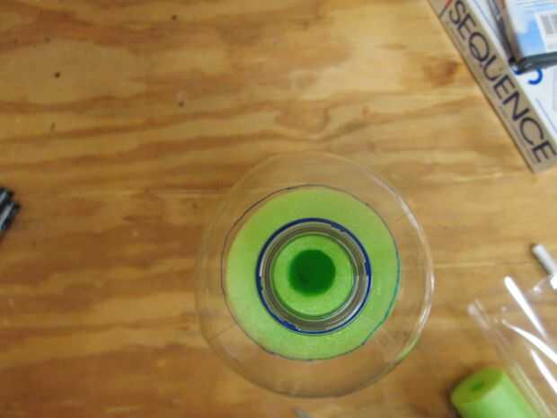 Luego tome un pedazo de los tallarines de la espuma y ponerlo dentro del cono a recortar. Marque cuidadosamente donde los tallarines toca el cono. Tendremos que cortar esto por lo que los tallarines se pueden pasar por el cono.
