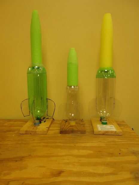 Aquí está una foto de un par de variaciones. Un cohete tiene 3 aletas con un poco más de superficie, y el otro está hecho de 20 oz botellas en lugar de botellas de 2 litros. Experimentar y hacer tus propias variaciones.