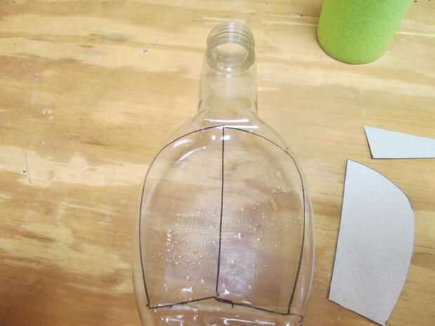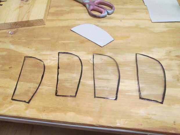 Usar un trozo de cartón de una caja de cereal para hacer una plantilla. La forma que utilicé para estas aletas era una aleta curvada de estilo retro. He podido seguir la forma de la botella y uso de la curva. He hecho la plantilla por lo que he podido conseguir dos aletas de cada lado de la botella. Trace una línea alrededor de la plantilla y comenzar a cortar las aletas. Una cosa que hago es cortar fuera de la línea para comenzar. Una vez que la forma áspera cortada, corte a la línea y el tamaño final. Trazado alrededor del perímetro con un marcador por lo que les pude ver mejor. Las aletas que tienen una curva leve y no sean perfectamente plana. Eso está bien. Estirarlas tan plano como puede pero no te preocupes si no son perfectos. Un poco de curva o waver no lastimará nada. Pude salir una botella de 4 aletas.