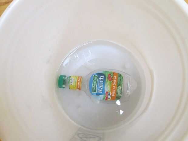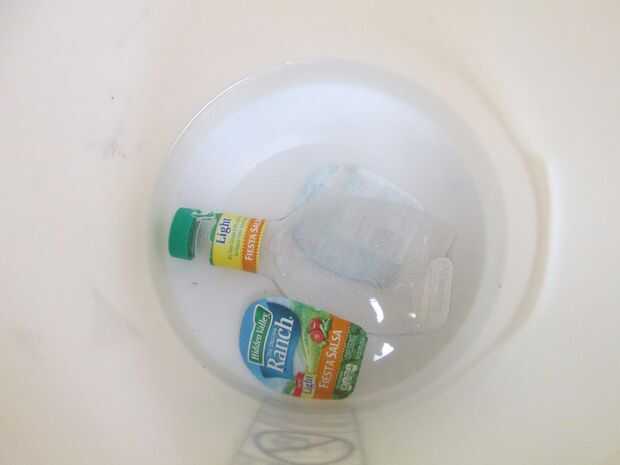 Para quitar la etiqueta de la botella de aderezo, coloque agua jabonosa caliente en el fregadero o un cubo. Llene la botella con agua tibia y sumergir en el agua jabonosa. En unos 10 minutos la etiqueta simplemente flotan apagado. Utilizar algunos Goo Gone para limpiar cualquier residuo de pegamento.