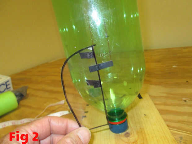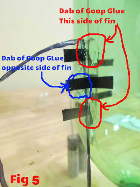 La figura 3 muestra la aleta con las tiras de cinta. El propósito de la cinta es mantener temporalmente la aleta en lugar mientras que se aplica el pegamento. La aleta debe sujetarse firmemente contra la botella con una separación mínima entre la botella y la aleta. Puede tomar un poco de práctica para grabar correctamente.