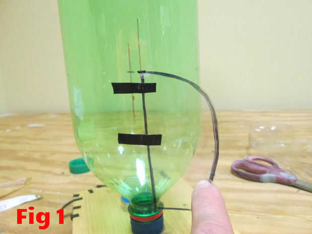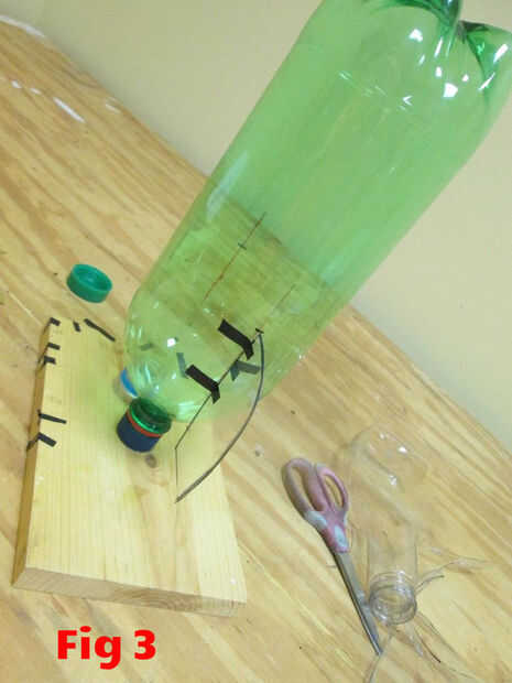 Poner dos tiras de cinta adhesiva en un lado de la aleta donde fijará a la botella. Pone la aleta plana contra la botella, la línea de la parte superior de la aleta con la marca que hiciste anteriormente, coloque el borde de la aleta en la línea y cinta adhesiva en su lugar. (Fig 1)